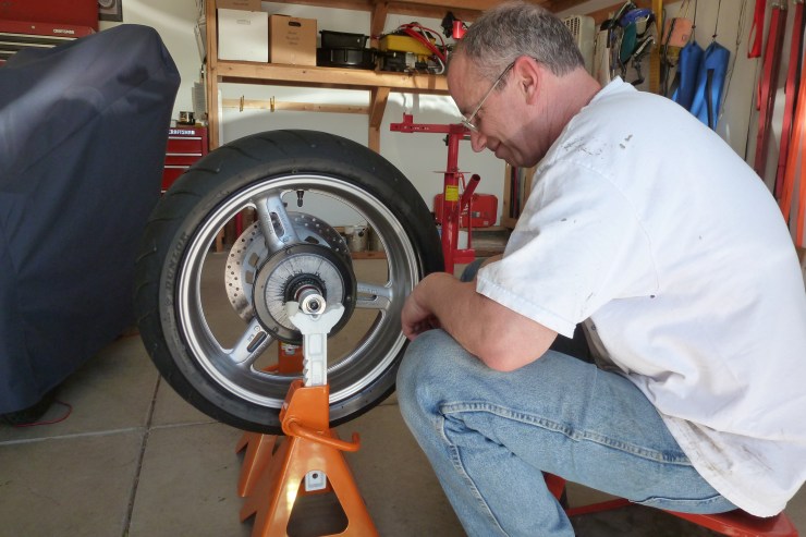 June 10, 2012January 21, 2018Cathy and Tom2 Comments on The Tire Change The Tire Change Four hours later, rides like a new bike! Front done and on to the rear. After mounting comes the static balance. This takes patience while waiting for the tire and wheel to settle out. Not fun when it’s 90F+ in the garage. Share this: Click to share on Facebook (Opens in new window) Facebook Click to email a link to a friend (Opens in new window) Email Like Loading...