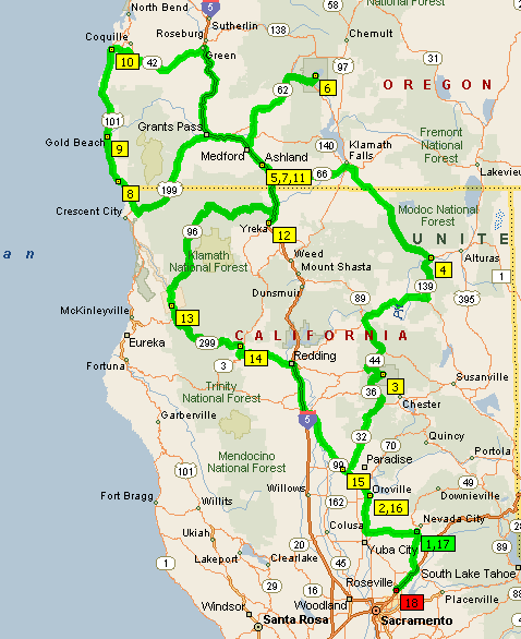 We’ll start from Cathy’s parents house in Grass Valley; they’ll be dog sitting the Duds. We’ll make our way up to Ashland via Mt. Lassen National Park. In Ashland we plan on seeing two shows at the Oregon Shakespeare Festival – Midsummer Night’s Dream and The Taming of the Shrew. We’ll take a day to go see Crater Lake and we’ll head to the coast for one night in Bandon, Or. On the way home, we’ll stay one night in Weaverville.
