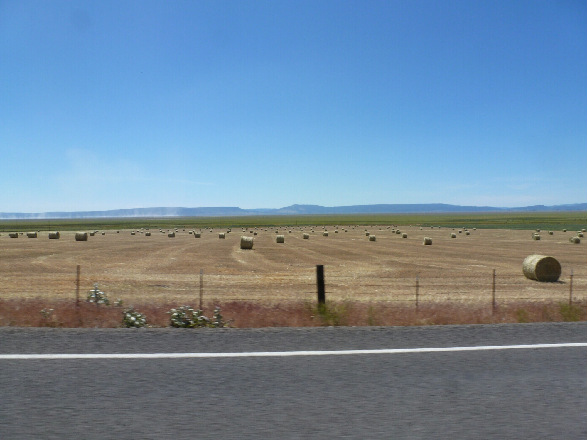 The most interesting part of this road was the geology and the semi-dried up lake beds that were stirring up dust in the distance. This one beyond the hay field was called Goose Lake.