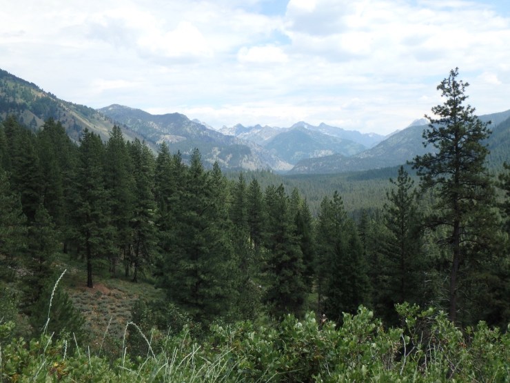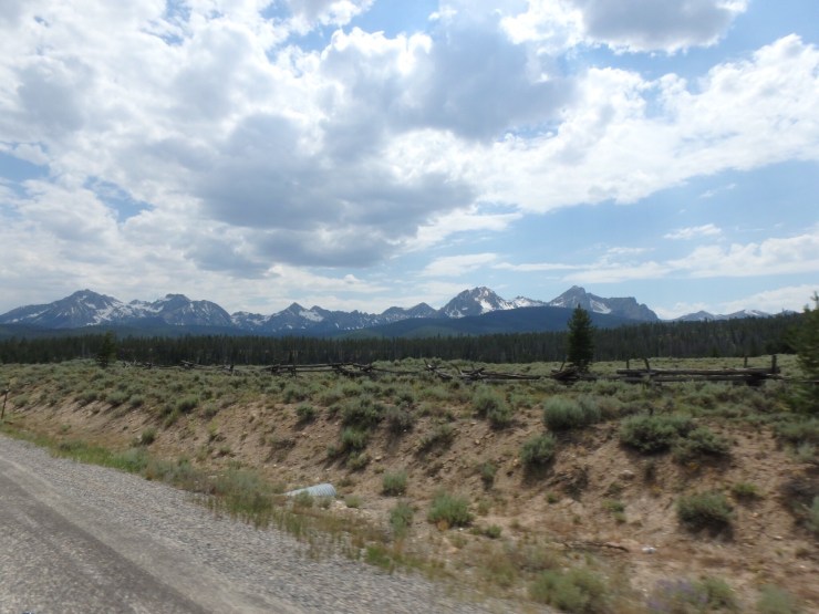 At Horseshoe Bend we turned north on Hwy 55 for a short while that followed one of the forks of the Payette and saw several kayaks navigating the rapids. This road was called the Ponderosa Pine Scenic Byway and was very twisty. Hundreds of curves later, we reached the Sawtooth Mountains which are spectacular. We could smell rain and see it in the distance. We encountered some damp roads but nary a drop on us!