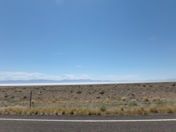 Soon this beautiful ride was over and we descended into the Great Basin which is surrounded by high desert mountains and laced with salt flats. And it’s windy.