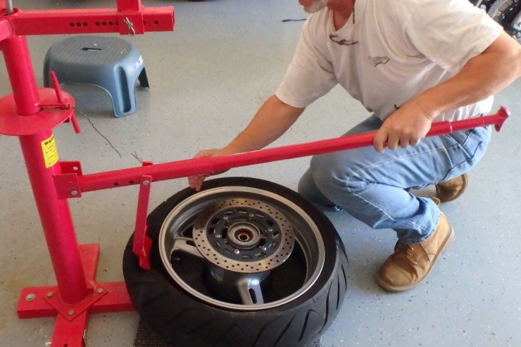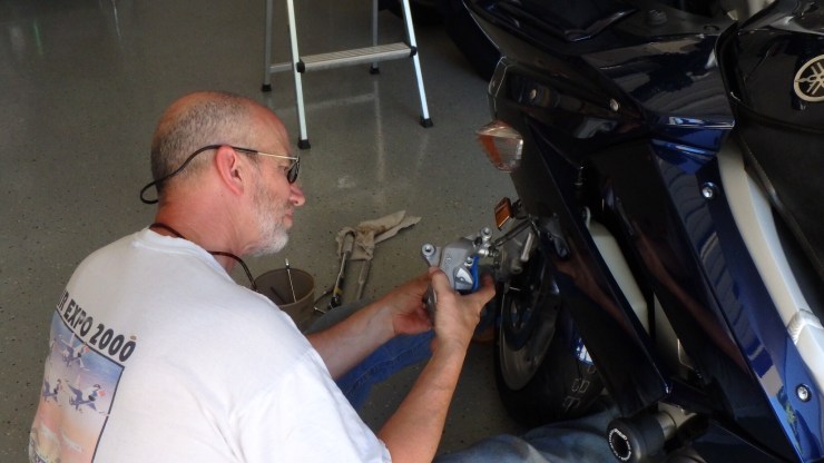 As always, the first step is to change the tires on the bike and give it a general look over. We also replaced the front brakes. Seems like we always find the hottest weekend of the summer to this – 105 degrees in a hot garage.