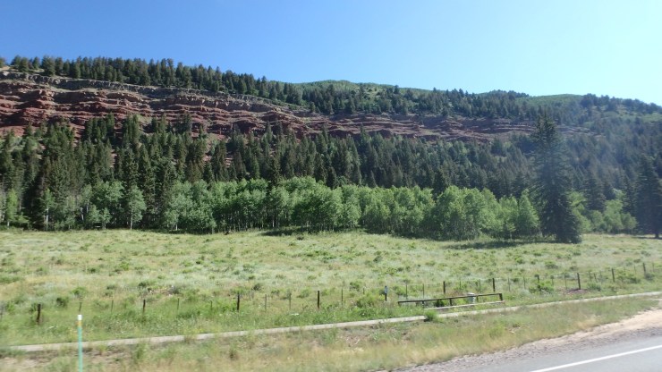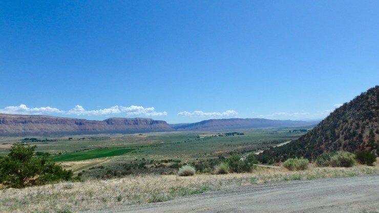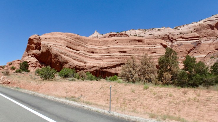 The road quickly descended and the temperature quickly climbed. We stopped and peeled off some layers. As we entered Utah, the temperature was already in the eighties before noon, but the scenery was beautiful.