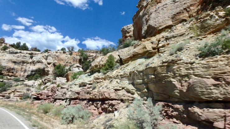The road quickly descended and the temperature quickly climbed. We stopped and peeled off some layers. As we entered Utah, the temperature was already in the eighties before noon, but the scenery was beautiful.