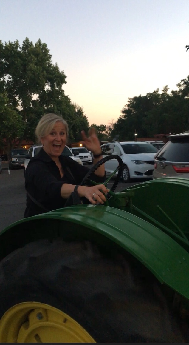 After dinner we tried in vain to find ice cream. Instead, we went back to take a picture of the John Deere tractor known as the Johnny Popper. The owner asked Tom if he wanted to drive it… duh!