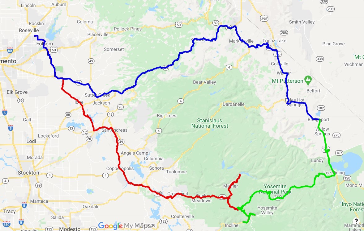 We are traveling through the Sierra Foothills and avoiding the main roads. We will enter the Yosemite from the west tomorrow, take the next day to tour around the park. On the third day we will take Tioga Pass, another first for us. We will exit on the east side of the park and stay in Bridgeport before heading home.