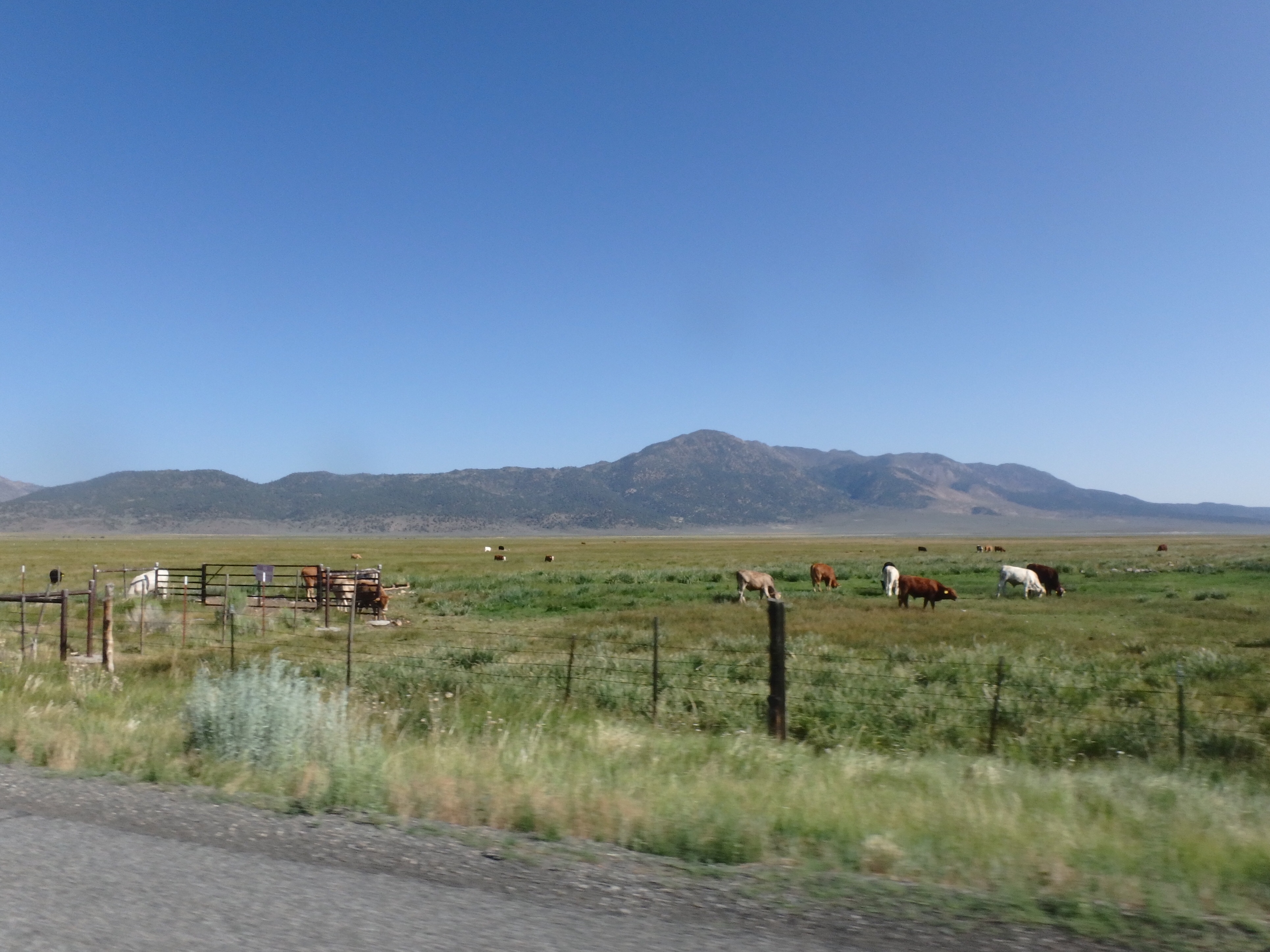 The weather was perfectly cool as we headed north on 395. The desert smells so good in the morning. Just outside of Bridgeport are large cattle ranches with the Sierra mountains looming in the distance.