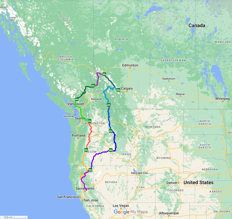The route will take us up the middle of Northern California and Oregon. In Washington, we’ll head to Sumas to enter Canada.