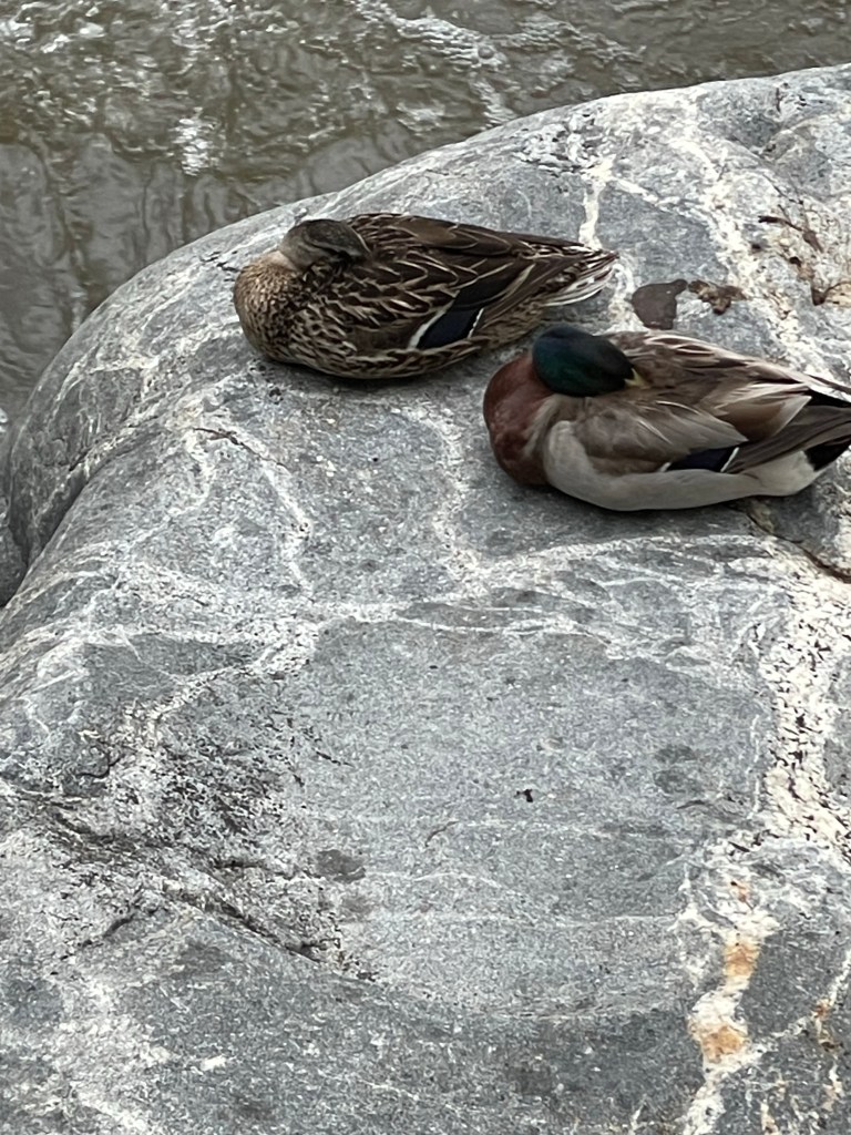 It sprinkled a little bit. Just enough to give us a rainbow. Just below our table on the deck, a pair of mallards bedded down for the night.