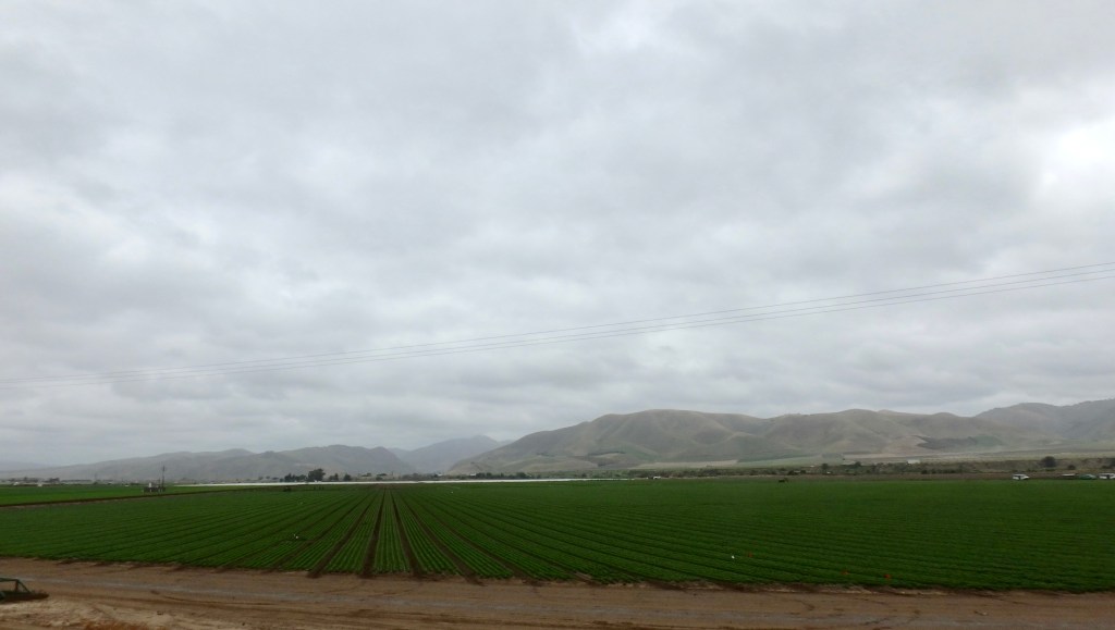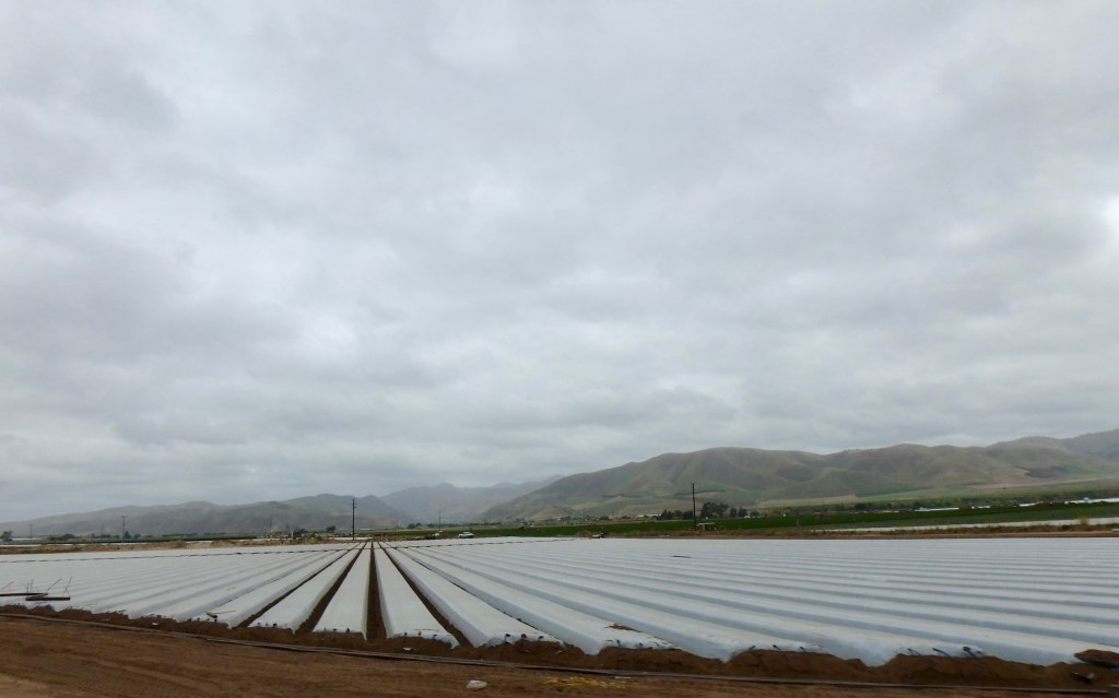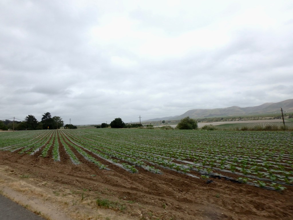 Soon we dropped down into beautiful vineyards and strawberry fields but the fog lingered.